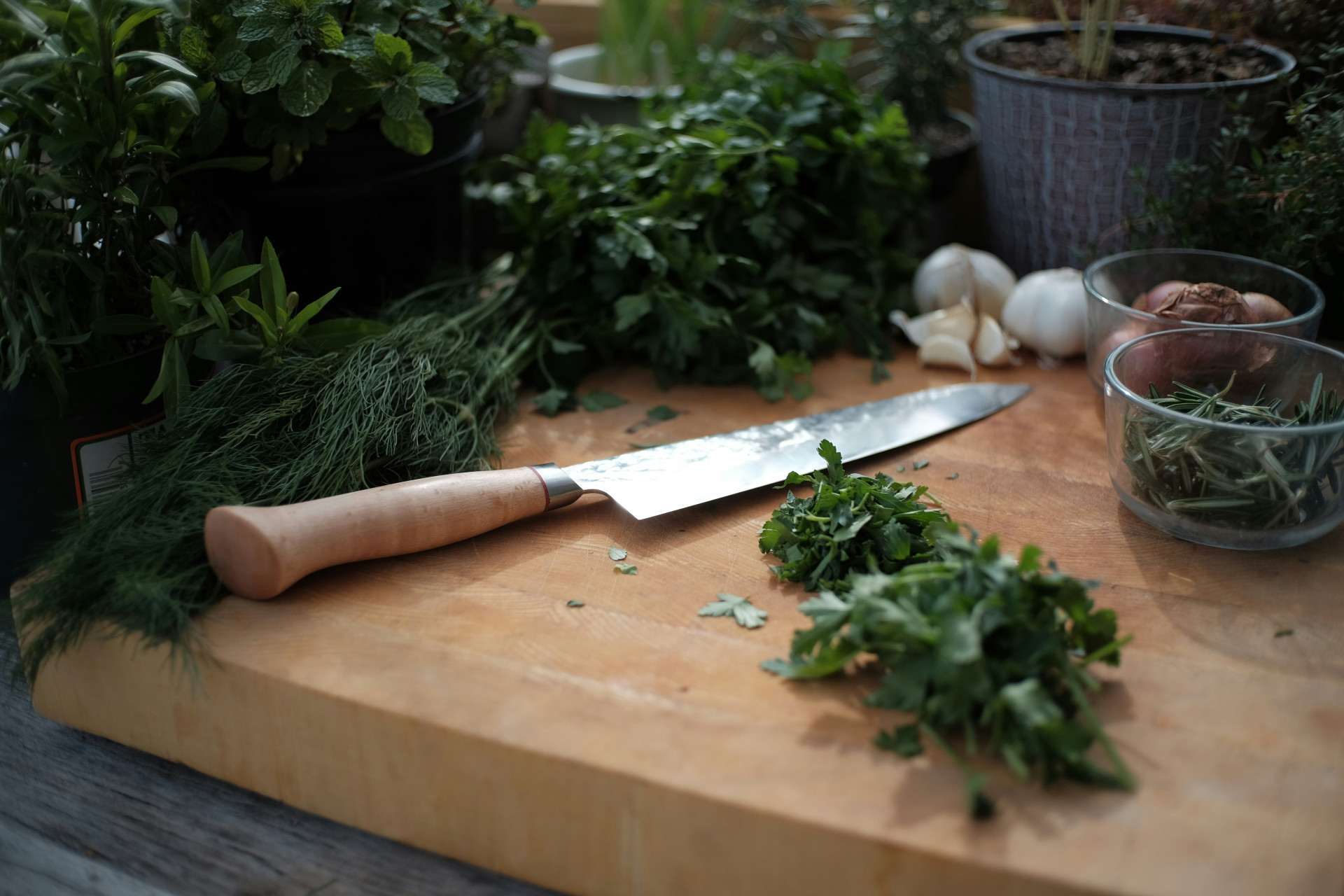 De fleste klarer sig fint med tre basisknive: en kokkekniv, en urtekniv og en brødkniv. Derefter kan du supplere med specialknive efter behov, f.eks. en fileteringskniv eller Santokukniv.